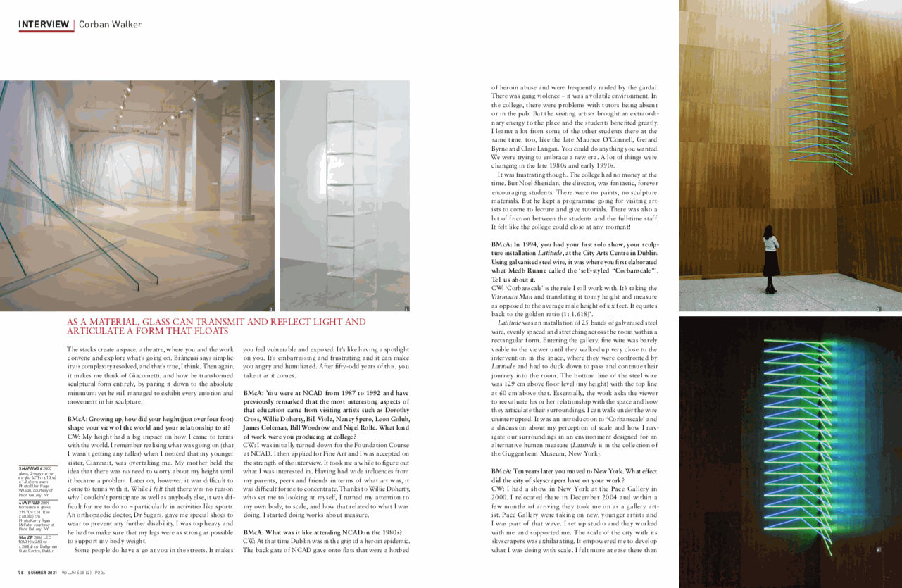 CW: ‘Corbanscale’ is the rule I still work with. It’s taking the Vitruvian Man and translating it to my height and measure as opposed to the average male height of six feet. It equates back to the golden ratio (1: 1.618)’. Latitude was an installation of 25 bands of galvanised steelwire, evenly spaced and stretching across the room within a rectangular form. Entering the gallery, fine wire was barely visible to the viewer until they walked up very close to the intervention in the space, where they were confronted by Latitude and had to duck down to pass and continue their journey into the room. The bottom line of the steel wire was 129 cm above floor level (my height) with the top line at 60 cm above that. Essentially, the work asks the viewer to reevaluate his or her relationship with the space and how they articulate their surroundings. I can walk under the wireuninterrupted. It was an introduction to ‘Corbanscale’ and a discussion about my perception of scale and how I nav- igate our surroundings in an environment designed for an alternative human measure (Latitude is in the collection of the Guggenheim Museum, New York).