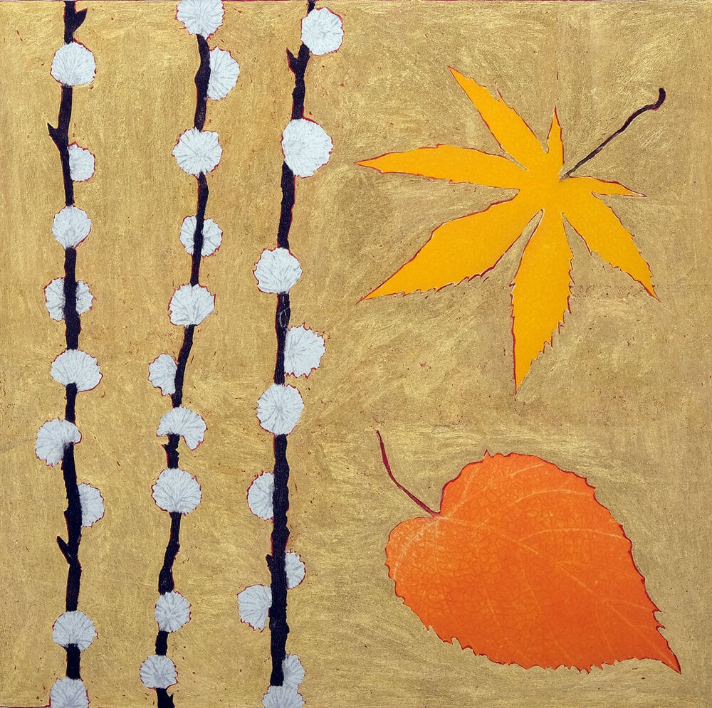 The carefully arranged willow catkins, the maple leaf and the autumn leaf from a cherry blossom tree were drawn using "a technique unchanged since medieval times".