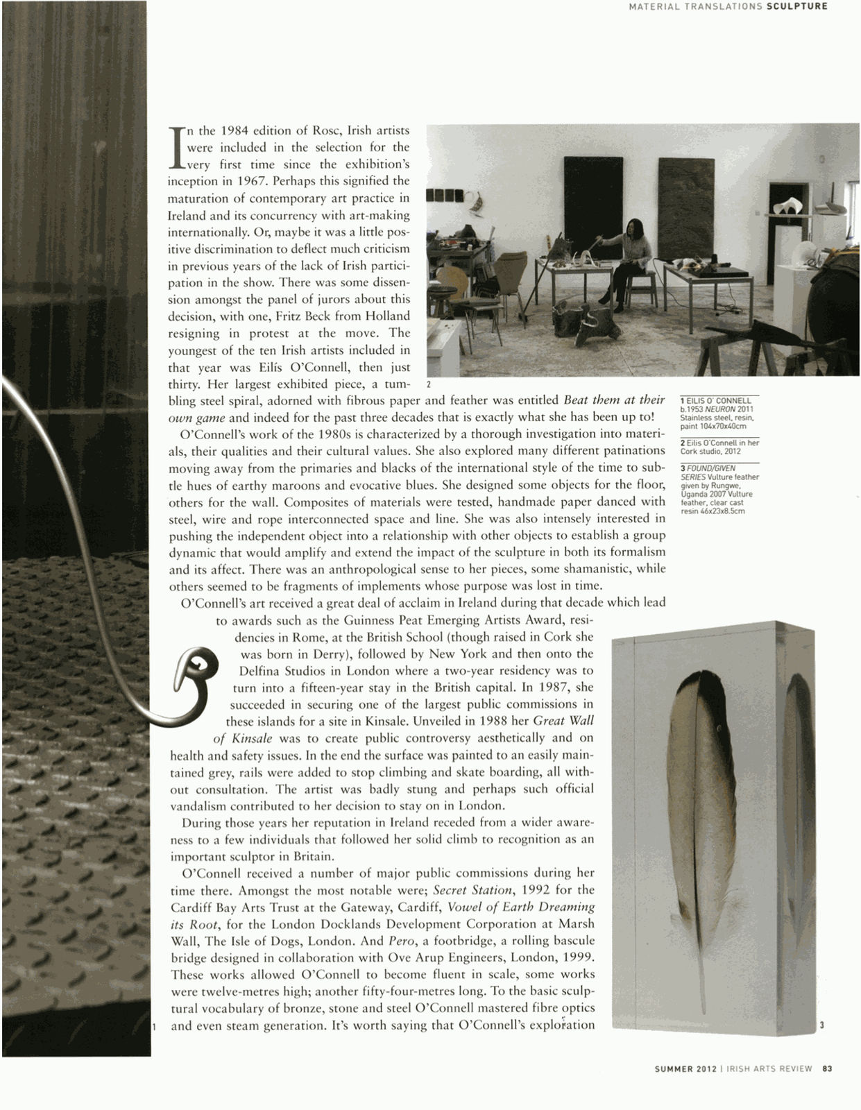 In the 1984 edition of Rosc, Irish artists were included in the selection for the very first time since the exhibition’s inception in 1967. Perhaps this signified the maturation of contemporary art practice in Ireland and its concurrency with art-making internationally. Or, maybe it was a little positive discrimination to deflect much criticism in previous years of the lack of Irish participation in the show. There was some dissension amongst the panel of jurors about this decision, with one, Fritz Beck from Holland resigning in protest at the move. The youngest of the ten Irish artists included in that year was Eilís O’Connell, then just thirty. Her largest exhibited piece, a tumbling steel spiral, adorned with fibrous paper and feather was entitled Beat them at their own game and indeed for the past three decades that is exactly what she has been up to!