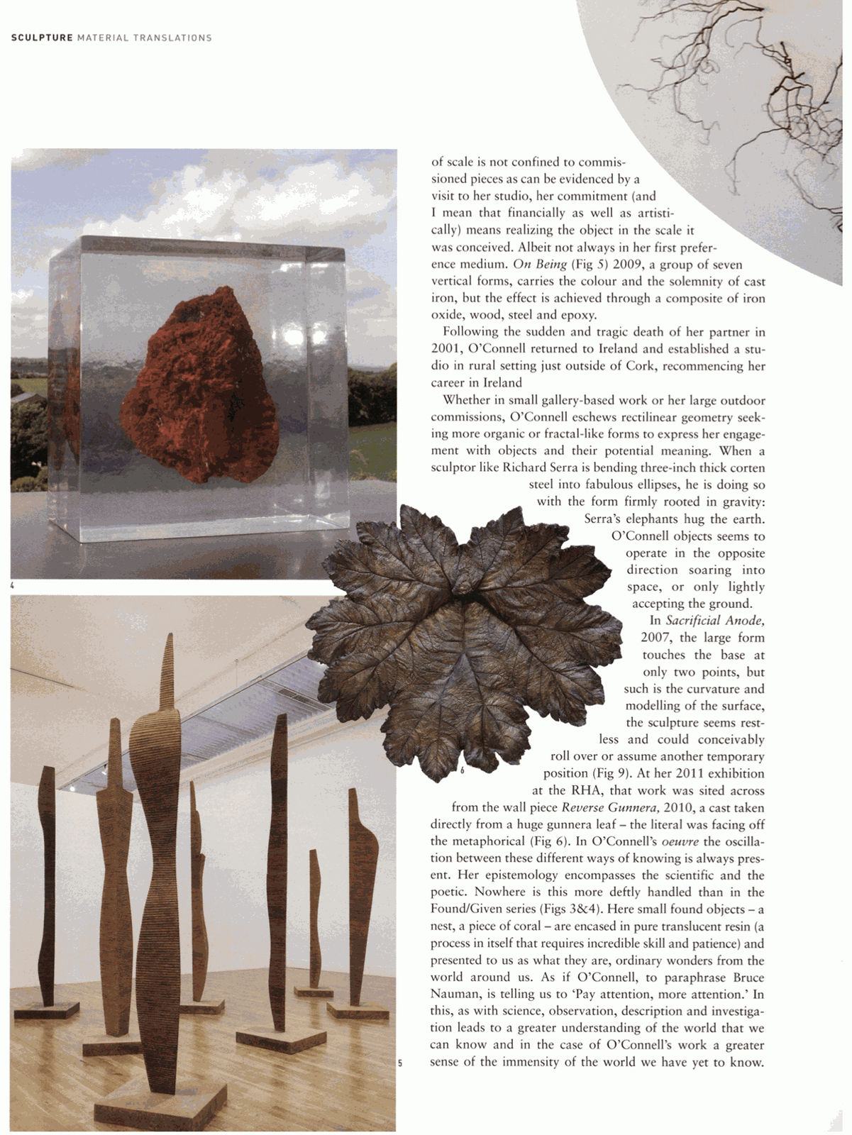 O’Connell received a number of major public commissions during her time there. Amongst the most notable were; Secret Station, 1992 for the Cardiff Bay Arts Trust at the Gateway, Cardiff, Vowel of Earth Dreaming its Root, for the London Docklands Development Corporation at Marsh Wall, The Isle of Dogs, London. And Pero, a footbridge, a rolling bascule bridge designed in collaboration with Ove Arup Engineers, London, 1999. These works allowed O’Connell to become fluent in scale, some works were twelve-metres high; another fifty-four-metres long. To the basic sculptural vocabulary of bronze, stone and steel O’Connell mastered fibre optics and even steam generation. It’s worth saying that O’Connell’s exploration of scale is not confined to commissioned pieces as can be evidenced by a visit to her studio, her commitment (and I mean that financially as well as artistically) means realizing the object in the scale it was conceived. Albeit not always in her first preference medium. On Being (Fig 5) 2009, a group of seven vertical forms, carries the colour and the solemnity of cast iron, but the effect is achieved through a composite of iron oxide, wood, steel and epoxy.