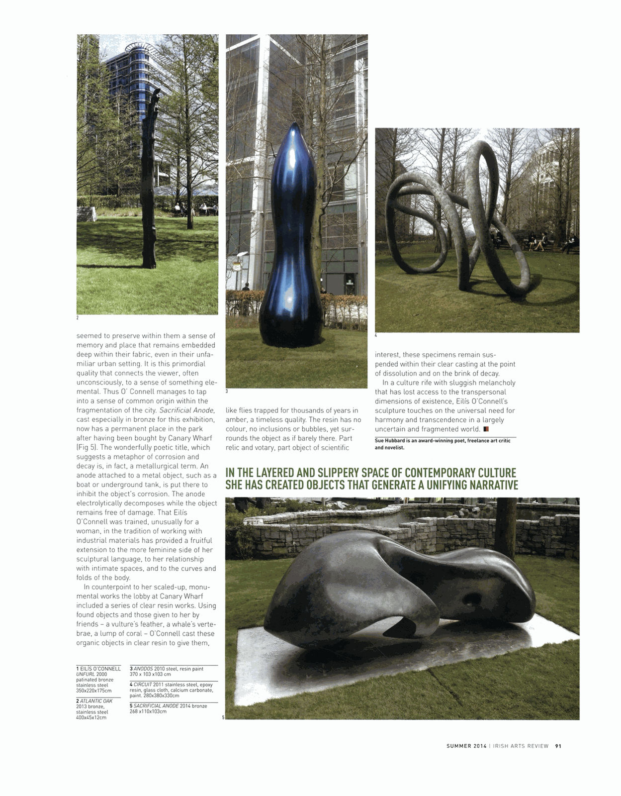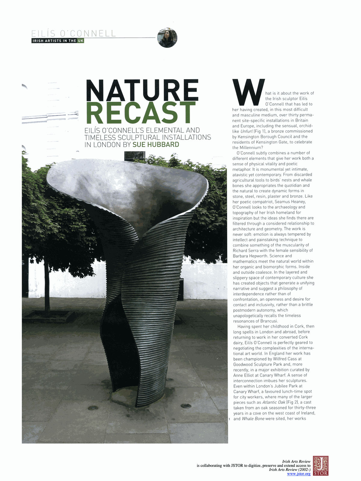What is it about the work of the Irish sculptor Eilís O’Connell that has led to her having created, in this most difficult and masculine medium, over thirty permanent site-specific installations in Britain and Europe, including the sensual, orchid-like Unfurl (Fig 1), a bronze commissioned by Kensington Borough Council and the residents of Kensington Gate, to celebrate the Millennium?
