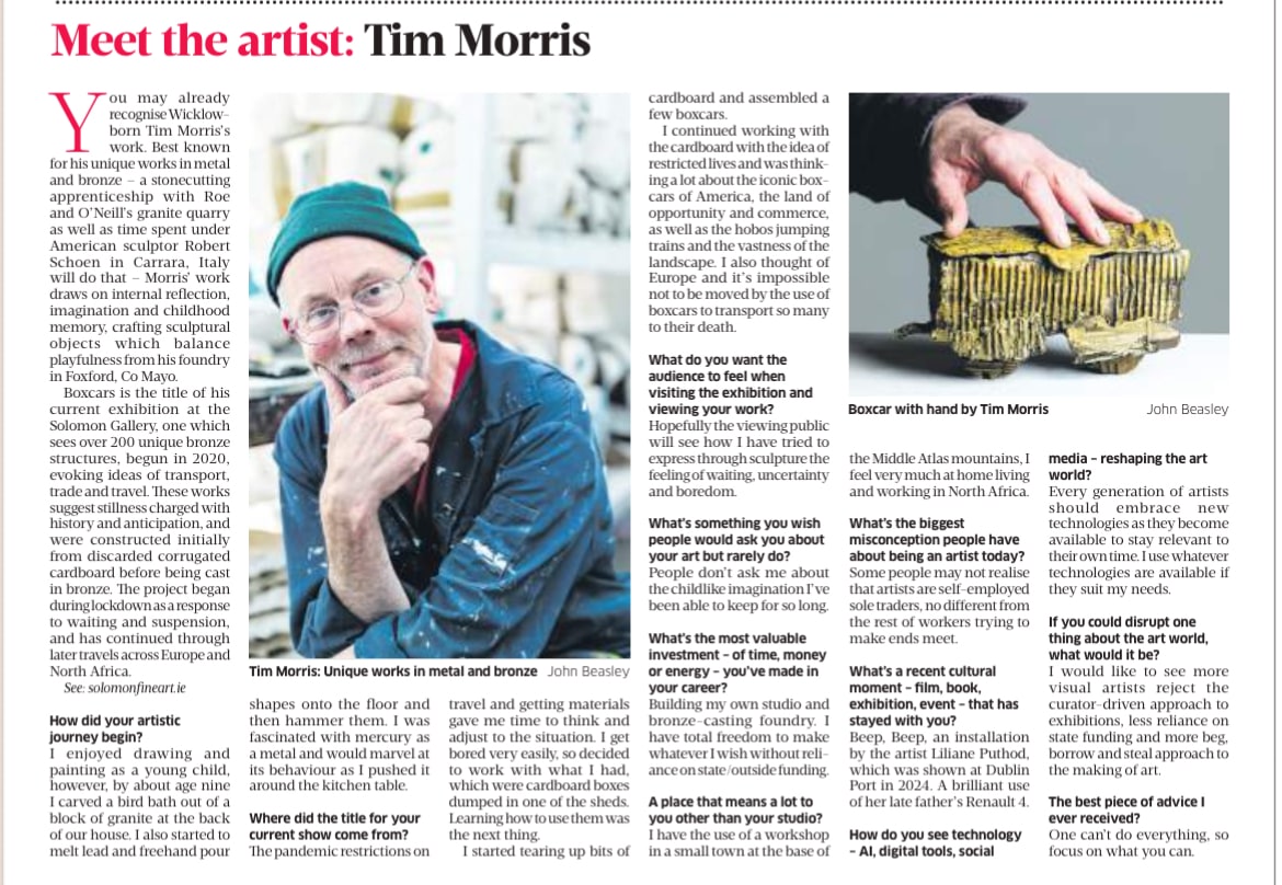 You may already recognise Wicklow-born Tim Morris's work. Best known for his unique works in metal and bronze - a stonecutting apprenticeship with Roe and O'Neill's granite quarry as well as time spent under American sculptor Robert Schoen in Carrara, Italy will do that - Morris' work draws on internal reflection, imagination and childhood memory, crafting sculptural objects which balance playfulness from his foundry in Foxford, Co Mayo.