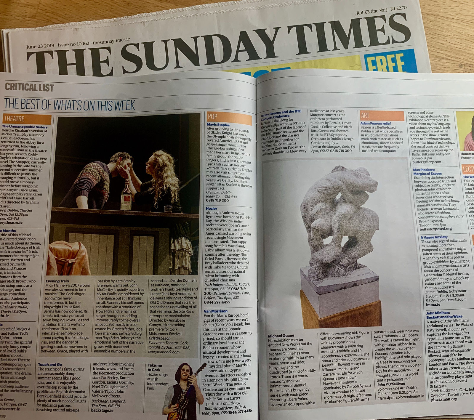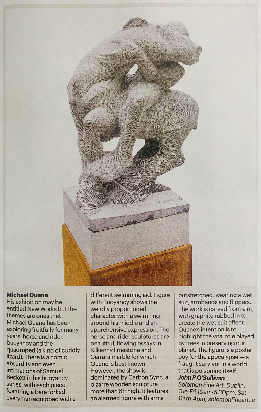 His exhibition may be entitled New Works but the themes are ones that Michael Quane has been exploring fruitfully for many years: horse and rider, buoyancy and the quadruped (a kind of cuddly lizard). There is a comic absurdity and even intimations of Samuel Beckett in his buoyancy series, with each piece featuring a bare forked everyman equipped with a different swimming aid. Figure with Buoyancy shows the weirdly proportioned character with a swim ring around his middle and an apprehensive expression. The horse and rider sculptures are beautiful, flowing essays in Kilkenny limestone and Carrara marble for which Quane is best known. However, the show is dominated by Carbon Sync, a bizarre wooden sculpture more than 6ft high. It features an alarmed figure with arms outstretched, wearing a wet suit, armbands and flippers. The work is carved from elm, with graphite rubbed in to create the wet-suit effect. Quane’s intention is to highlight the vital role played by trees in preserving our planet. The figure is a poster boy for the apocalypse — a fraught survivor in a world that is poisoning itself.